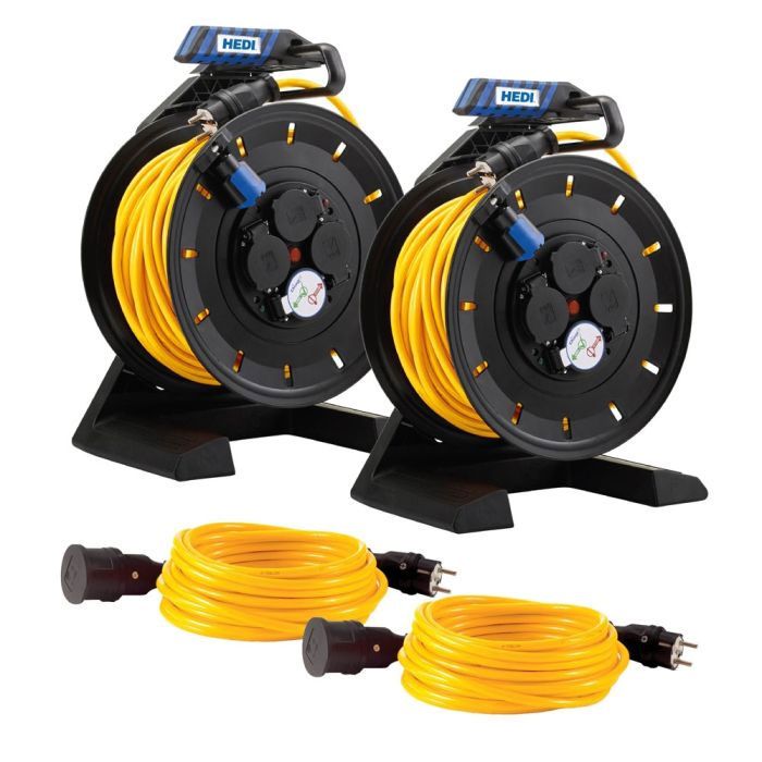Bedruckungs-Paket 3.22, 2 x Kabeltrommel Professional Kunststoff in Schwarz, 40 m 2 x Panzerkabel-Verlängerungsleitungen PLUS, 10 m Gelb H07BQ-F 3G2,5