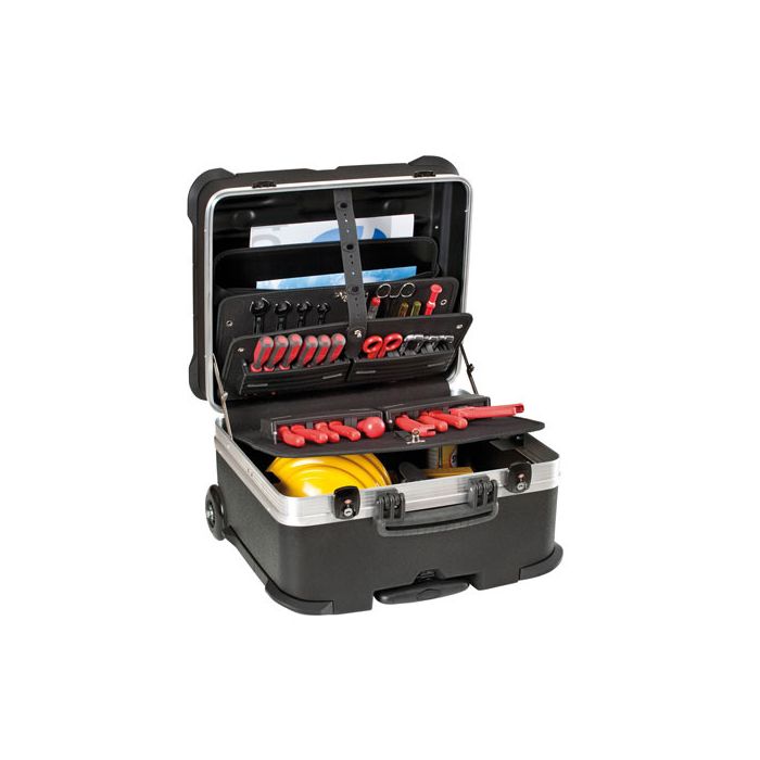 Dokumententasche im Deckelbereich und zwei Werkzeugtafeln, die nach oben geöffnet sind. Somit fallen die Werkzeuge beim Transport nicht so leicht heraus. Der Boden bietet zusätzlichen Stauraum für große Werkzeuge. Die Bodenschale ist mit vorgeschnittenem Schaum ausgefüllt. Der Koffer ist fahrbar. Er hat kugelgelagerte Hartkunststoffrollen und eine einstellbare
